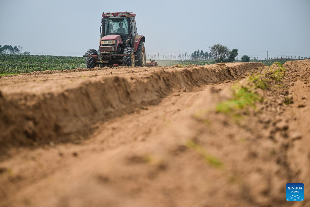 An employee drives an agricultural machine to level farmland at a cactus planting base in Danzhou, south China's Hainan Province, Feb. 20, 2023. This cactus planting base covers an area of more than 1,300 mu (about 86 hectares). It has integrated agriculture, technology and tourism to boost local employment and economy. (Xinhua/Pu Xiaoxu)