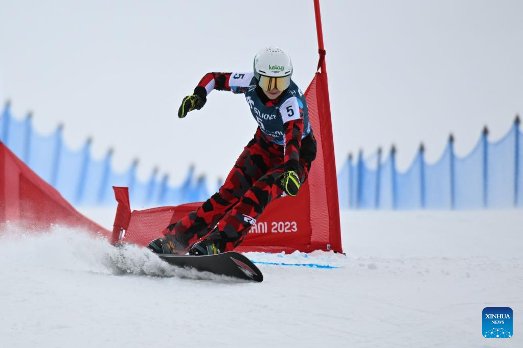 Arvid Auner of Austria competes during the Men's Parallel Slalom competition at the FIS Snowboard, Freestyle and Freeski World Championships in Bakuriani, Georgia, on Feb. 21, 2023. (Photo by Tamuna Kulumbegashvili/Xinhua)