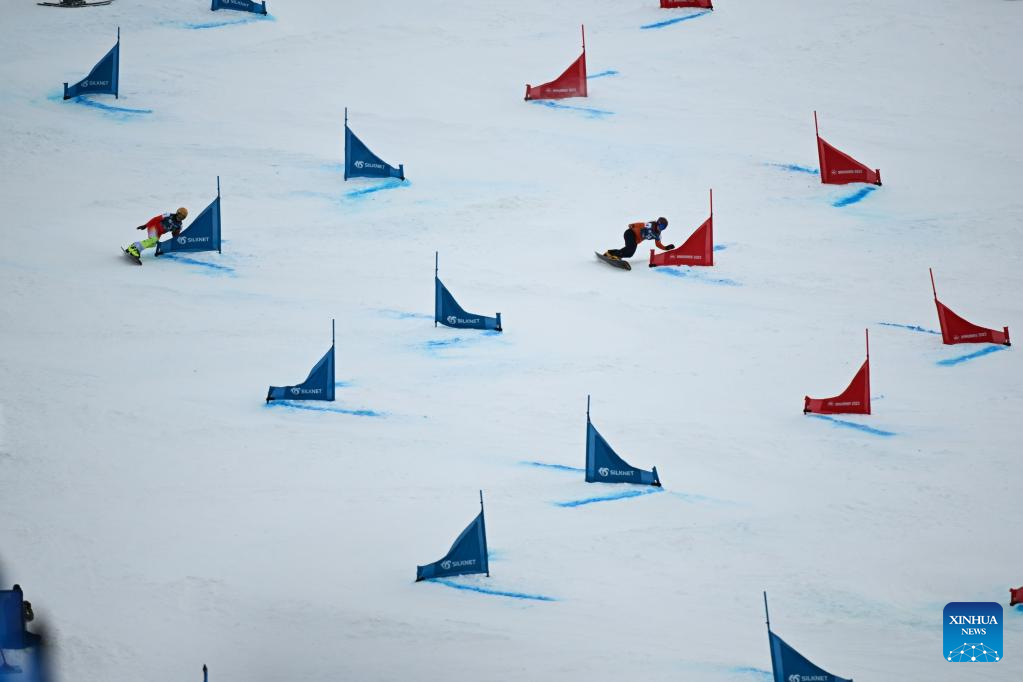 Skiers compete during the Women's Parallel Slalom competition at the FIS Snowboard, Freestyle and Freeski World Championships in Bakuriani, Georgia, on Feb. 21, 2023. (Photo by Tamuna Kulumbegashvili/Xinhua)