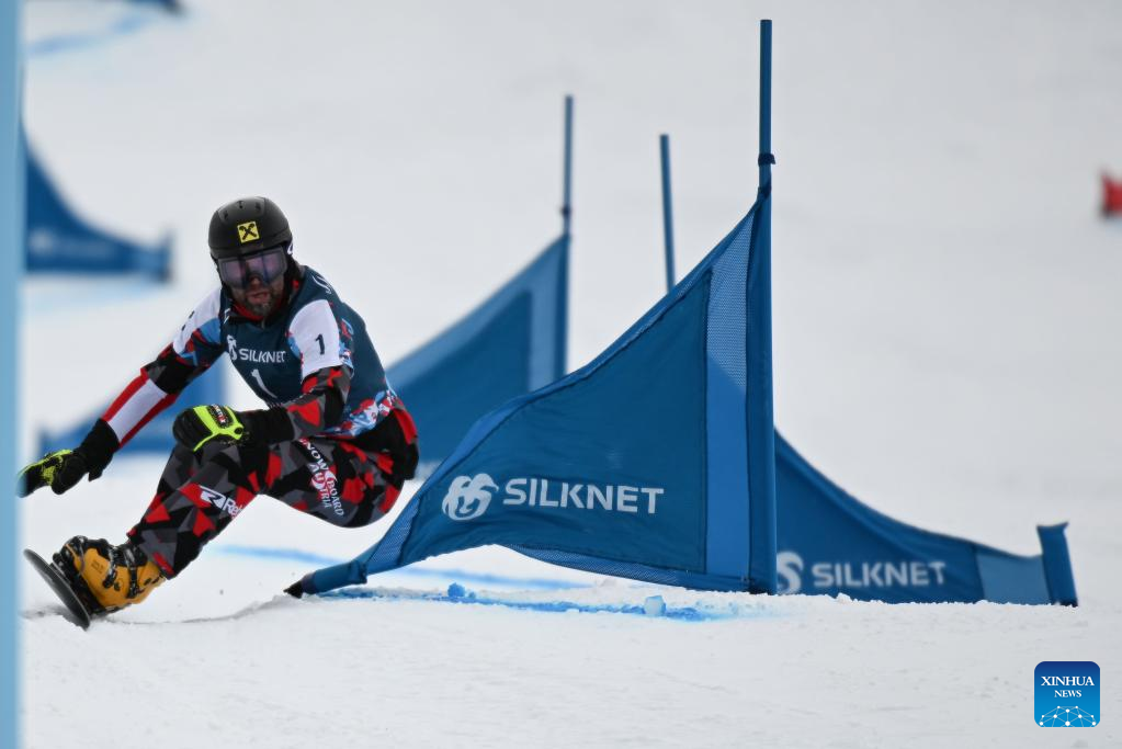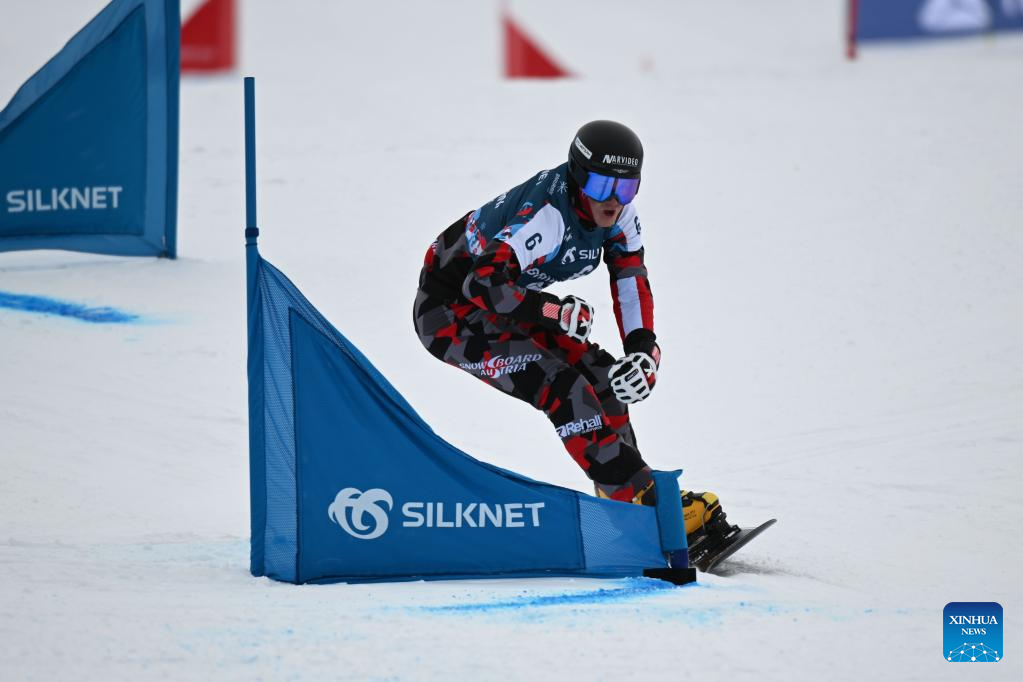 Andreas Prommegger of Austria competes during the Men's Parallel Slalom competition at the FIS Snowboard, Freestyle and Freeski World Championships in Bakuriani, Georgia, on Feb. 21, 2023. (Photo by Tamuna Kulumbegashvili/Xinhua)