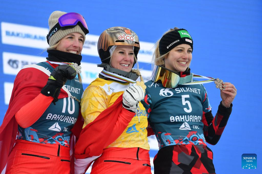 Gold medalist Julie Zogg (C) of Switzerland, silver medalist Ladina Jenny (L) of Switzerland and bronze medalist Sabine Schoeffmann of Austria pose during the awarding ceremony of the Women's Parallel Slalom competition at the FIS Snowboard, Freestyle and Freeski World Championships in Bakuriani, Georgia, on Feb. 21, 2023. (Photo by Tamuna Kulumbegashvili/Xinhua)