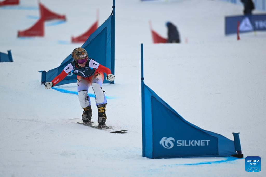 Sabine Schoeffmann of Austria competes during the Women's Parallel Slalom competition at the FIS Snowboard, Freestyle and Freeski World Championships in Bakuriani, Georgia, on Feb. 21, 2023. (Photo by Tamuna Kulumbegashvili/Xinhua)