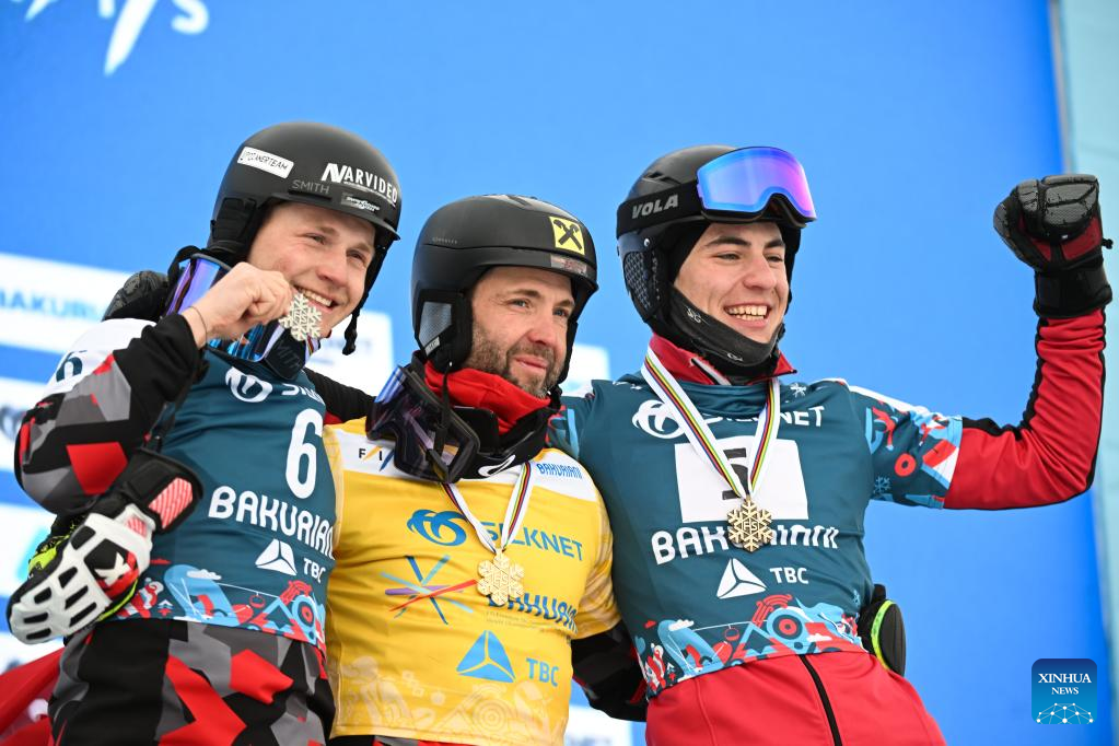 Gold medalist Andreas Prommegger (C) of Austria, silver medalist Arvid Auner (L) of Austria and bronze medalist Arnaud Gaudet of Canada pose during the awarding ceremony of the Men's Parallel Slalom competition at the FIS Snowboard, Freestyle and Freeski World Championships in Bakuriani, Georgia, on Feb. 21, 2023. (Photo by Tamuna Kulumbegashvili/Xinhua)