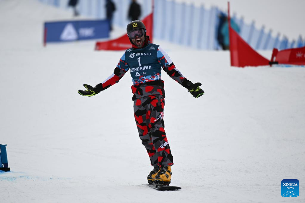 Andreas Prommegger of Austria reacts during the Men's Parallel Slalom competition at the FIS Snowboard, Freestyle and Freeski World Championships in Bakuriani, Georgia, on Feb. 21, 2023. (Photo by Tamuna Kulumbegashvili/Xinhua)