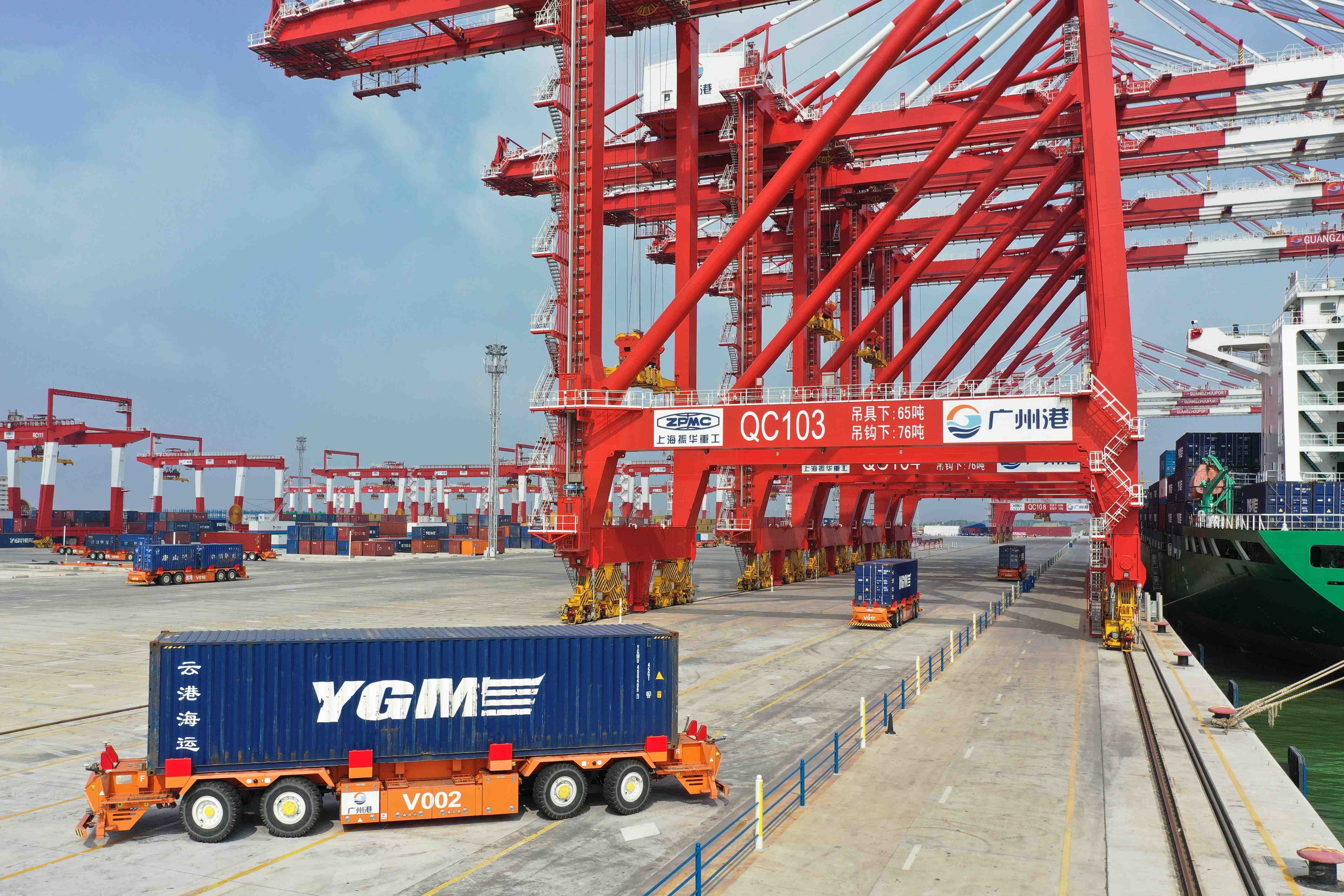 Intelligent guided vehicles transport containers under the orders from a smart control system at the fully automated terminal of Nansha port in Guangzhou, capital of south China's Guangdong province. (People's Daily Online/Liu Wei)