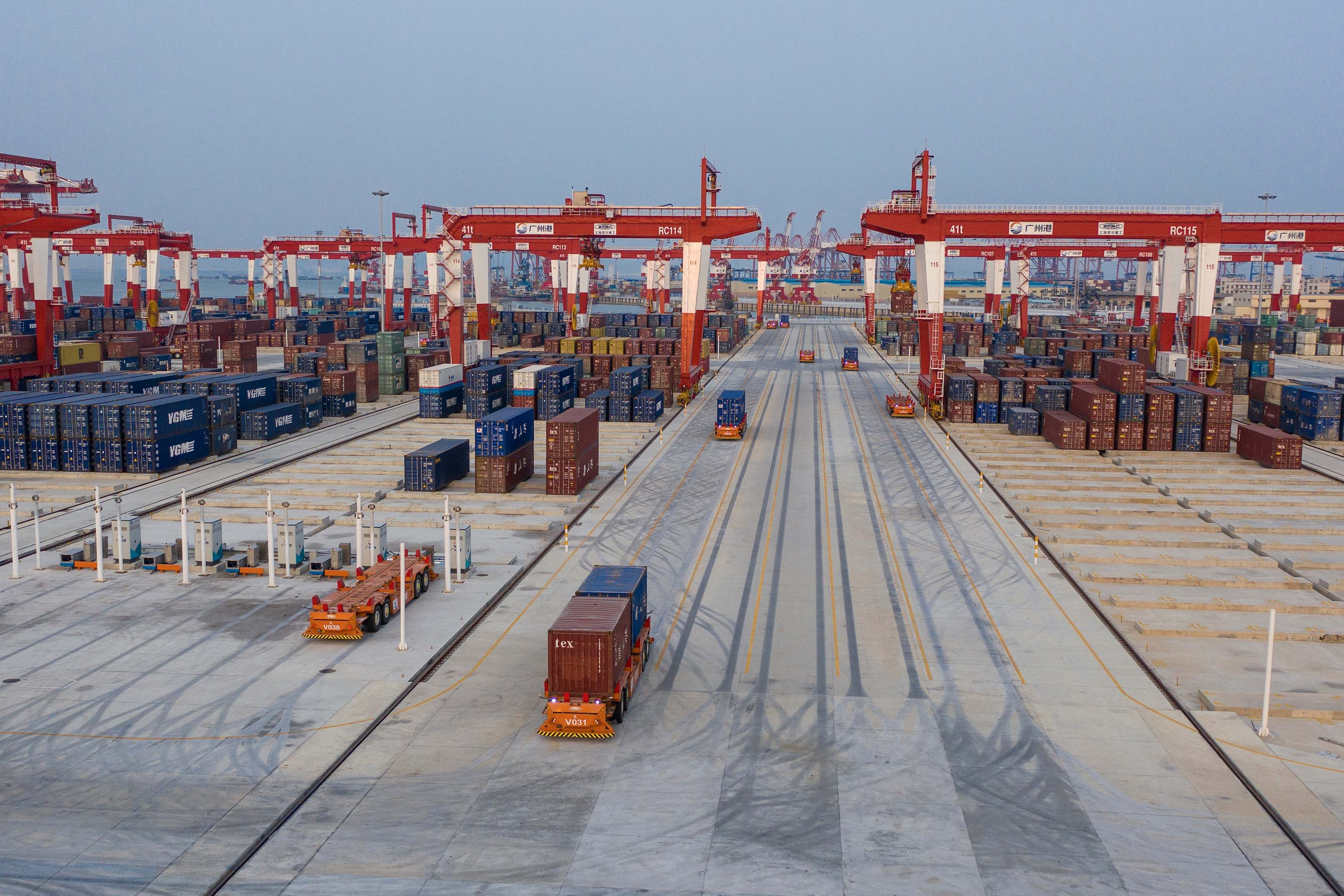 Intelligent guided vehicles are transporting containers. (People's Daily Online/Qiu Xinsheng)