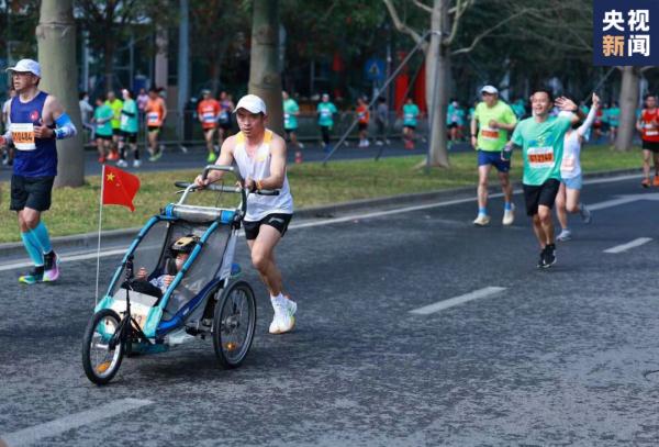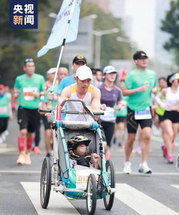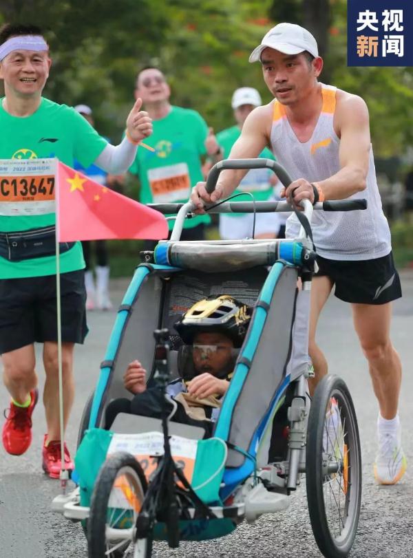 A father caught widespread attention when he crossed the finish line while pushing his son in a tricycle at the Shenzhen Marathon 2022, which was held on Feb. 19, 2023.