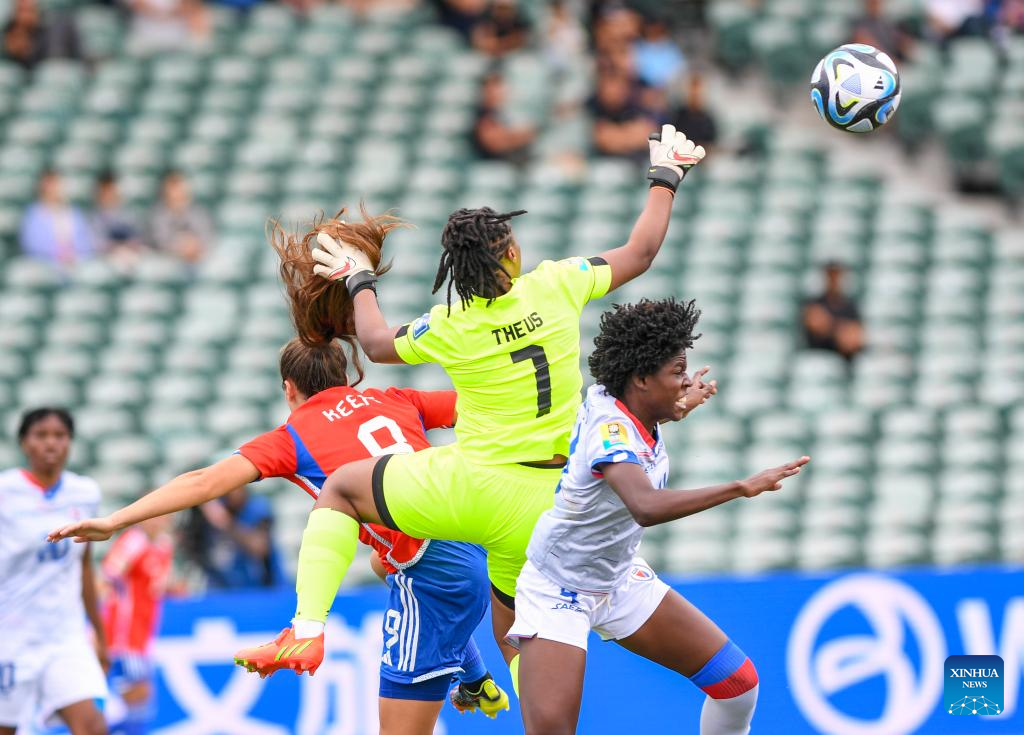 Sonya Keefe (L) of Chile vies with Kerly Theus (C), goalkeeper of Haiti, during a group B play-off tournament match between Chile and Haiti for the FIFA Women's World Cup Australia and New Zealand 2023 at the North Harbour Stadium in Auckland, New Zealand, Feb. 22, 2023. (Xinhua/Guo Lei)
