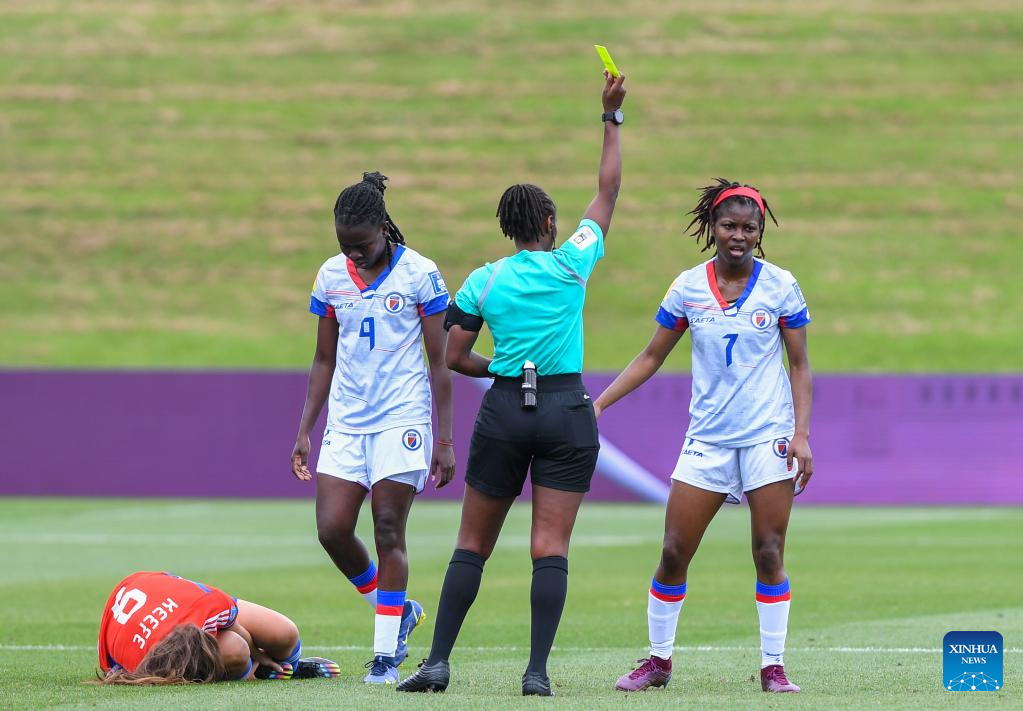 Batcheba Louis (R) of Haiti is shown a yellow card by the referee during a group B play-off tournament match between Chile and Haiti for the FIFA Women's World Cup Australia and New Zealand 2023 at the North Harbour Stadium in Auckland, New Zealand, Feb. 22, 2023. (Xinhua/Guo Lei)