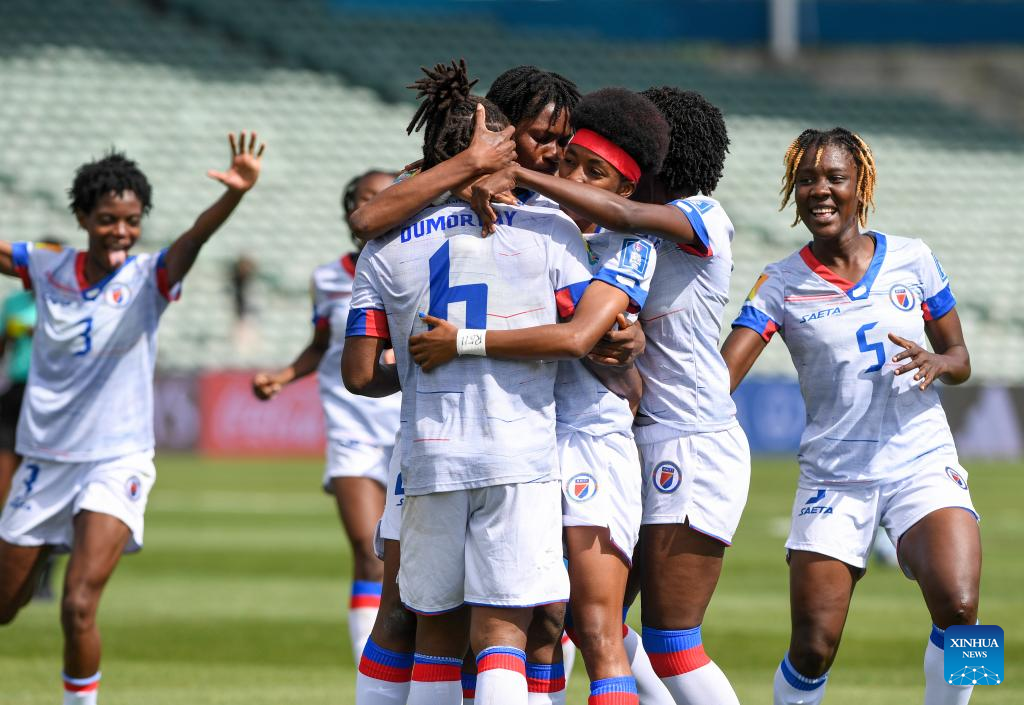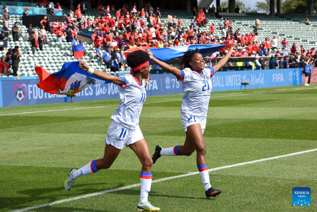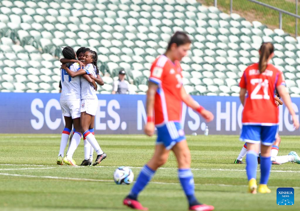Players of Haiti celebrate after scoring during a group B play-off tournament match between Chile and Haiti for the FIFA Women's World Cup Australia and New Zealand 2023 at the North Harbour Stadium in Auckland, New Zealand, Feb. 22, 2023. Haiti was qualified for the FIFA Women's World Cup finals for the first time after winning the match 2-1. (Xinhua/Guo Lei)