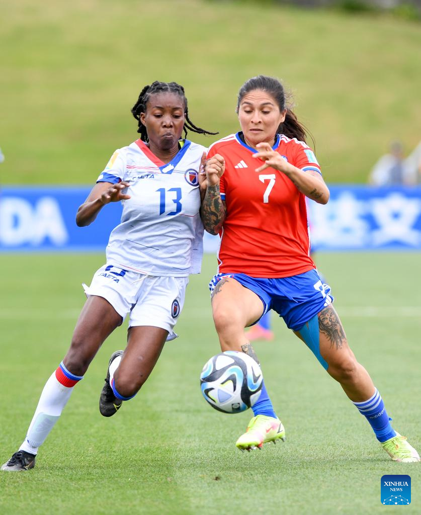 Yenny Acuna (R) of Chile vies with Betina Petit-Frere of Haiti during a group B play-off tournament match between Chile and Haiti for the FIFA Women's World Cup Australia and New Zealand 2023 at the North Harbour Stadium in Auckland, New Zealand, Feb. 22, 2023. (Xinhua/Guo Lei)