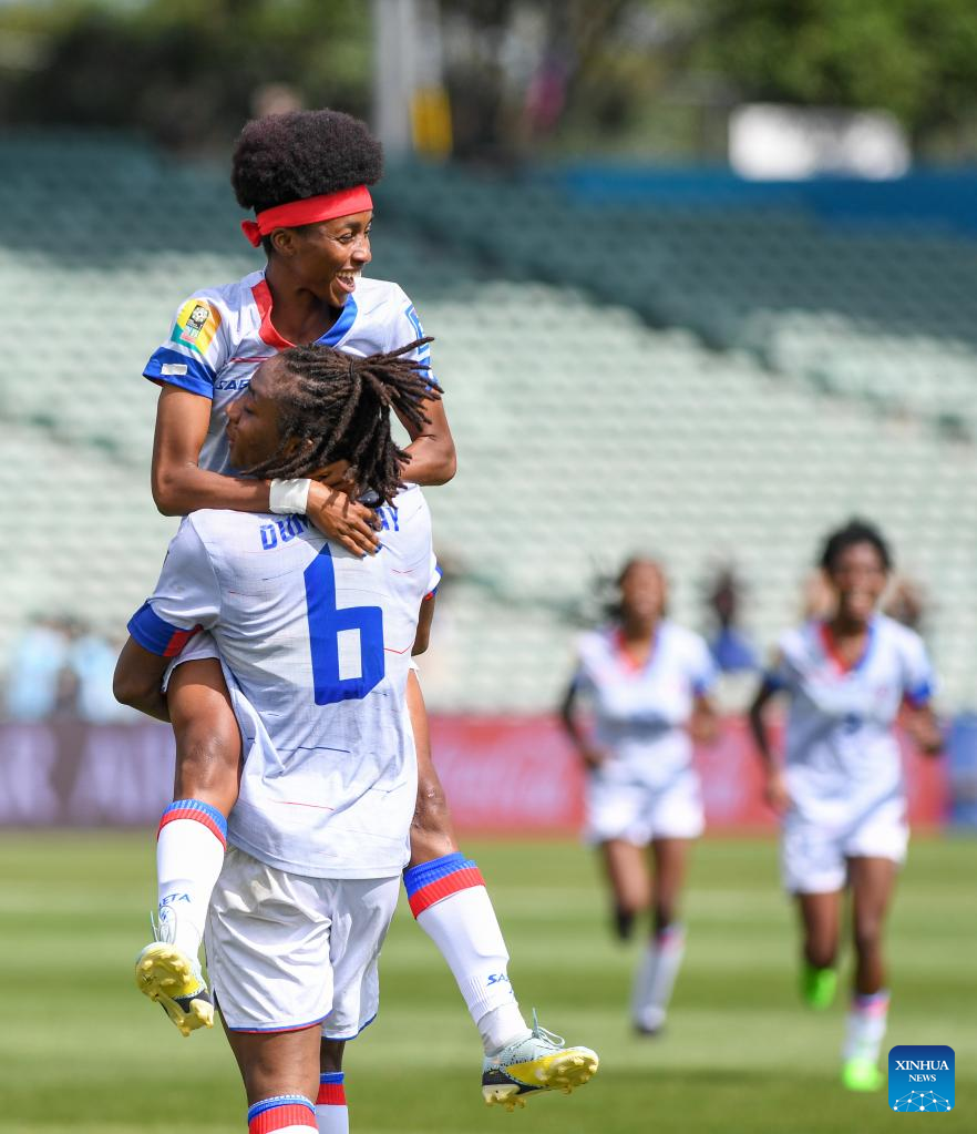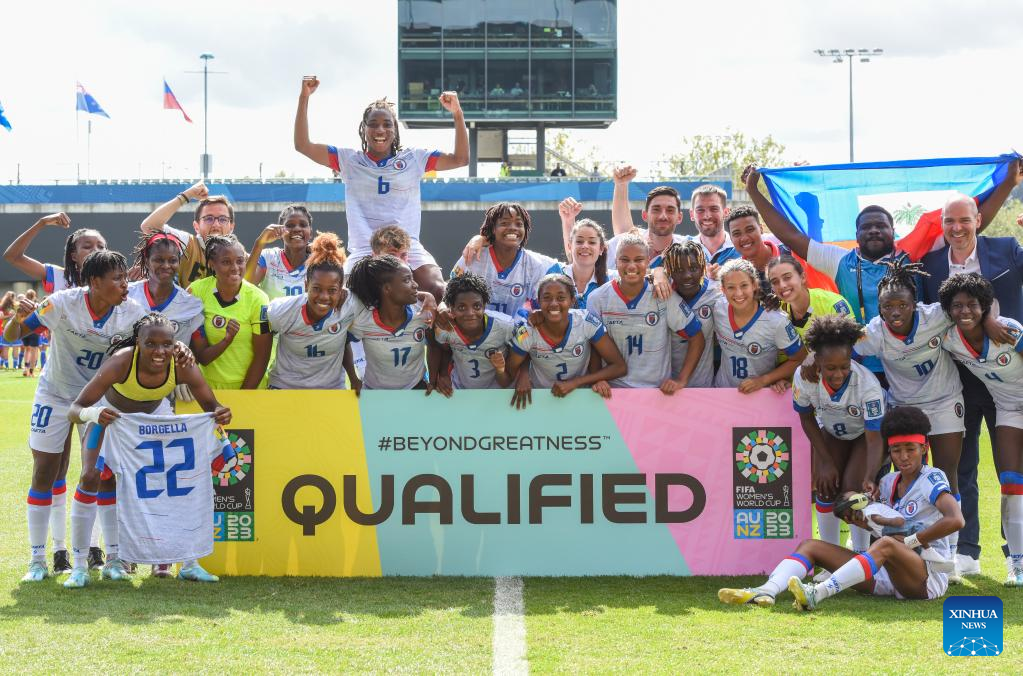 Members of Team Haiti celebrate after a group B play-off tournament match between Chile and Haiti for the FIFA Women's World Cup Australia and New Zealand 2023 at the North Harbour Stadium in Auckland, New Zealand, Feb. 22, 2023. Haiti was qualified for the FIFA Women's World Cup finals for the first time after winning the match 2-1. (Xinhua/Guo Lei)