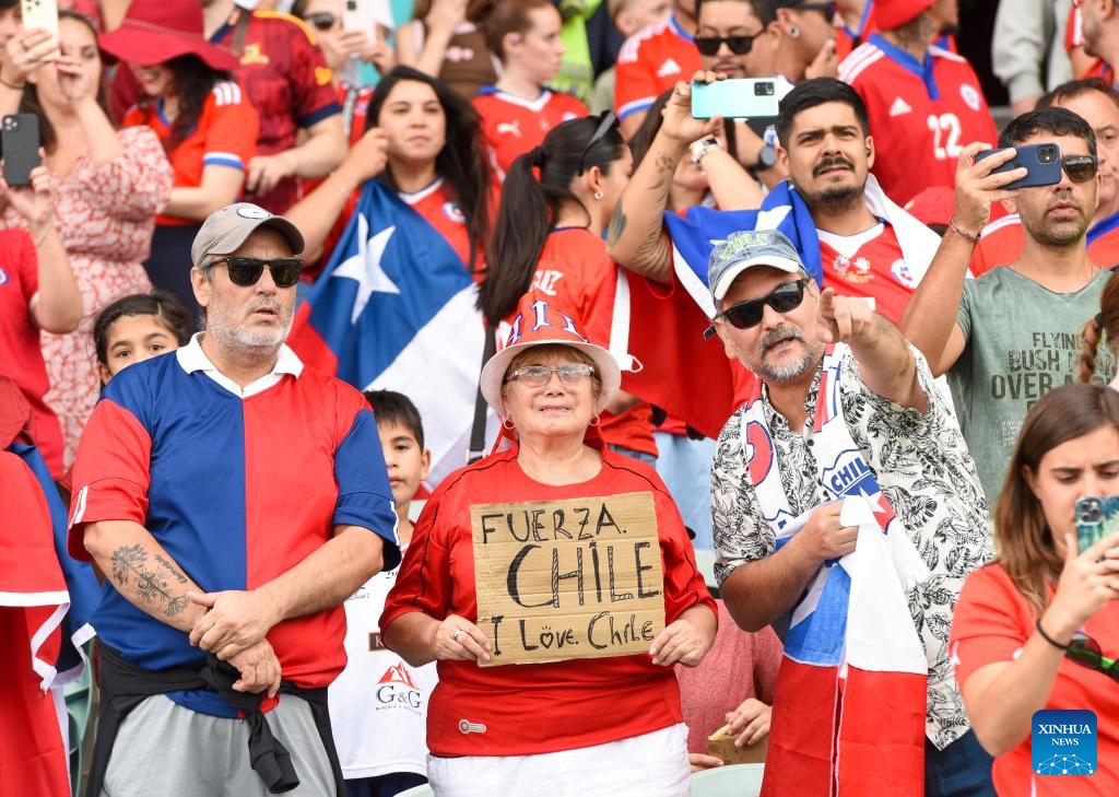 Fans of Chile cheer for their team during a group B play-off tournament match between Chile and Haiti for the FIFA Women's World Cup Australia and New Zealand 2023 at the North Harbour Stadium in Auckland, New Zealand, Feb. 22, 2023. (Xinhua/Guo Lei)