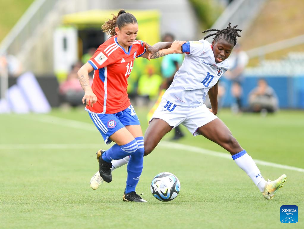 Isidora Olave (L) of Chile vies with Nerilia Mondesir of Haiti during a group B play-off tournament match between Chile and Haiti for the FIFA Women's World Cup Australia and New Zealand 2023 at the North Harbour Stadium in Auckland, New Zealand, Feb. 22, 2023. (Xinhua/Guo Lei)