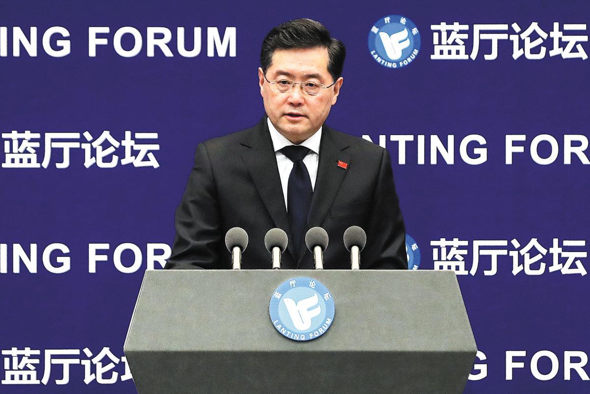 Foreign Minister Qin Gang addresses the Lanting Forum on Tuesday in Beijing. [Photo by Wang Zhuangfei/ China Daily]