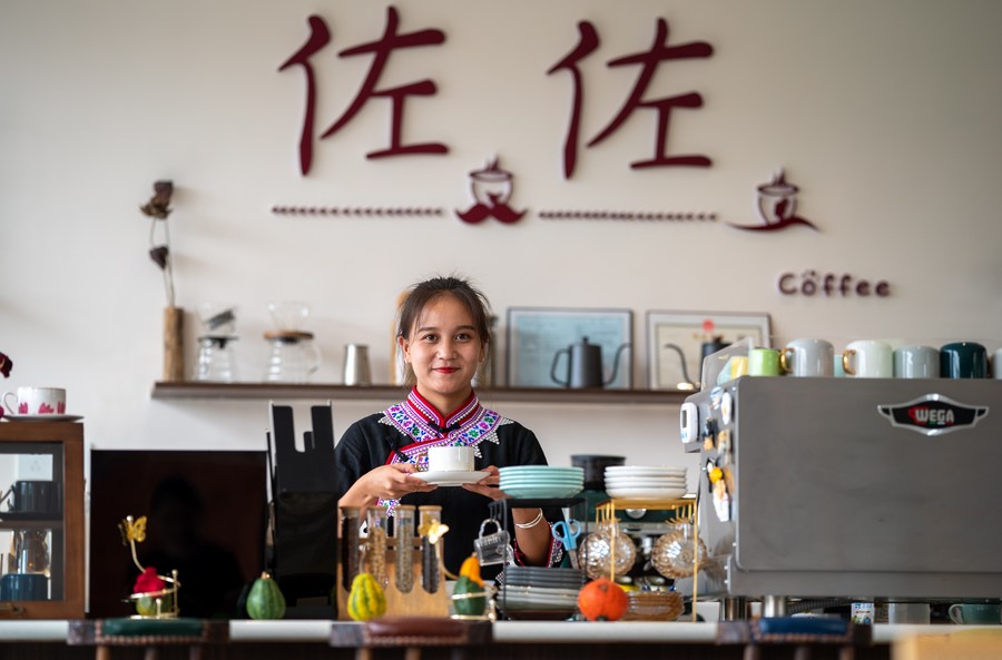 Villager Ge Nasi makes a cup of coffee at her coffee shop in Banli Village of Donghui Town, Lancang Lahu Autonomous County in Pu'er City, southwest China's Yunnan Province, July 7, 2022. (Xinhua/Jiang Wenyao)