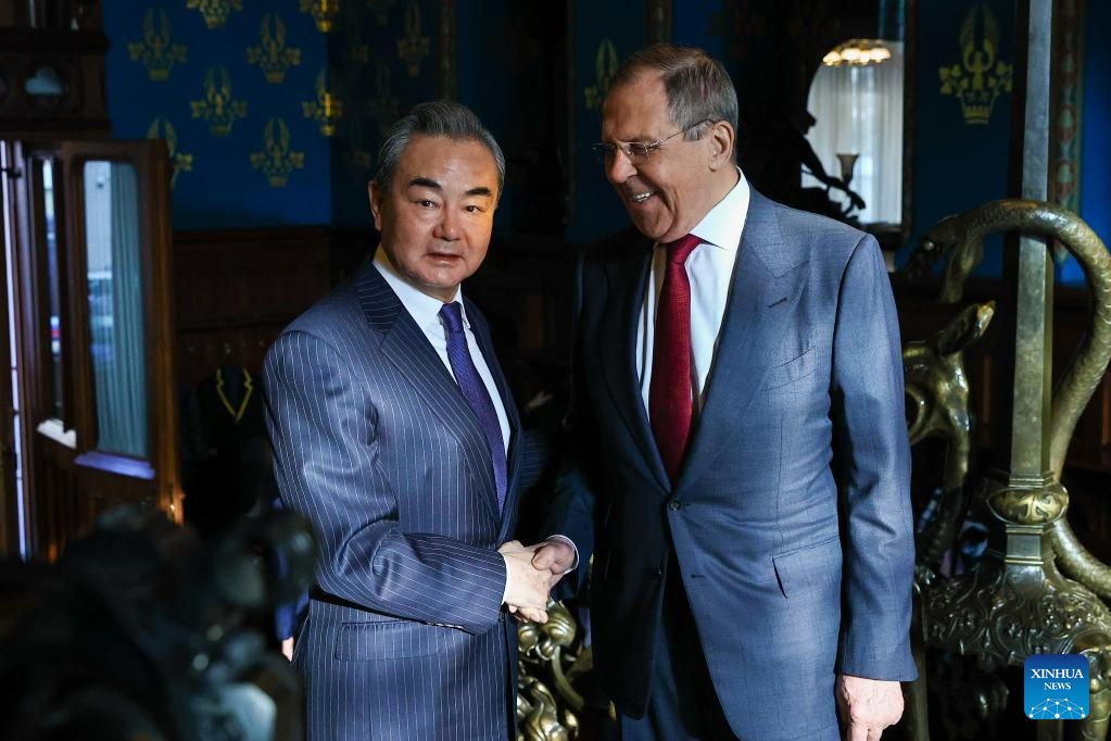 Wang Yi, a member of the Political Bureau of the Communist Party of China (CPC) Central Committee and director of the Office of the Foreign Affairs Commission of the CPC Central Committee, meets with Russian Foreign Minister Sergei Lavrov in Moscow, Russia, Feb. 22, 2023. (Russian Foreign Ministry/Handout via Xinhua)
