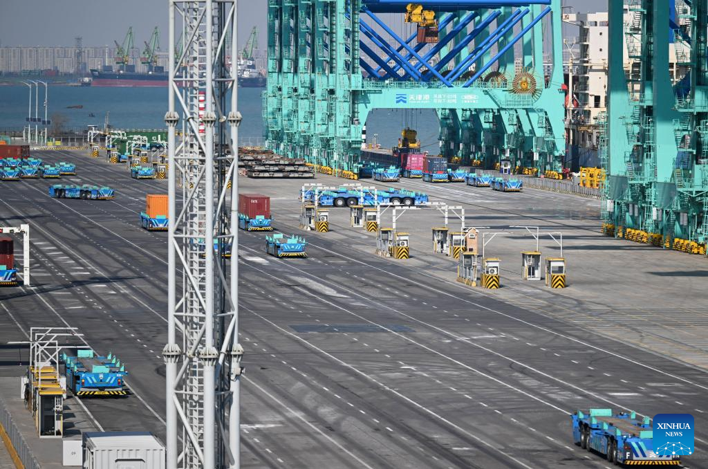 Smart delivery robots work at the full Internet of Things container terminal of Tianjin Port in north China's Tianjin, Feb. 21, 2023.