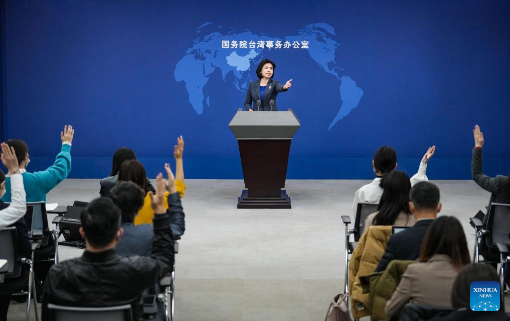 Zhu Fenglian, spokesperson for the Taiwan Affairs Office of the State Council, gestures at a press conference in Beijing, capital of China, Feb. 22, 2023.