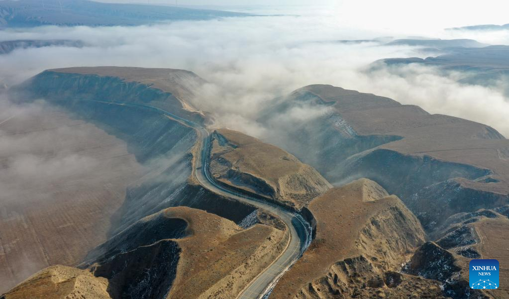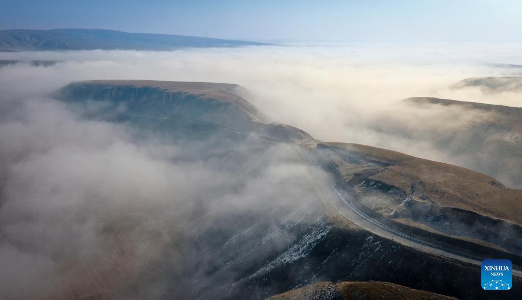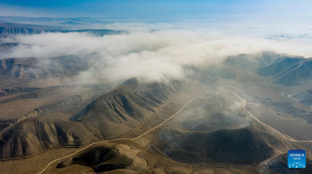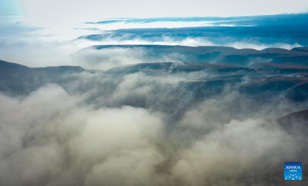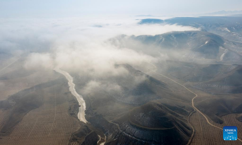 This aerial photo taken on Feb. 22, 2023 shows a sea of clouds near Liangjiachuan Village of Laozhuang Township in Tongxin County, Wuzhong, northwest China's Ningxia Hui Autonomous Region. (Xinhua/Feng Kaihua)