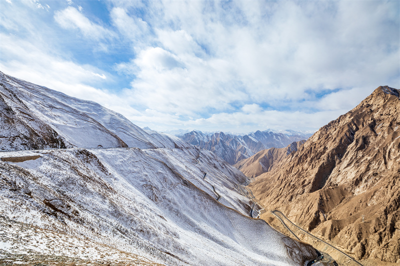 The Xinjiang-Tibet Highway, traversing the snow-covered Karakoram mountain range and glaciers, is dubbed a “sky road”.