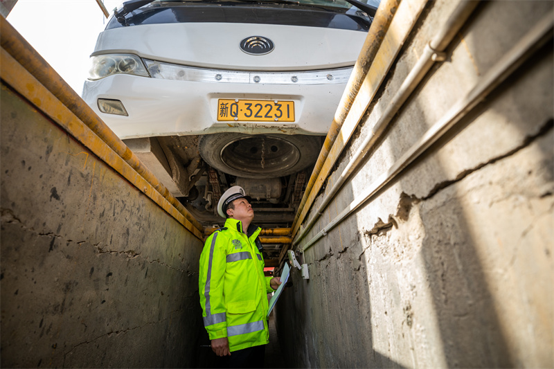He Haidong, deputy head of Yecheng’s traffic police team, along with his colleague, inspected eight buses for the transport mission at 8 a.m., Feb. 16, making sure there were no glitches.