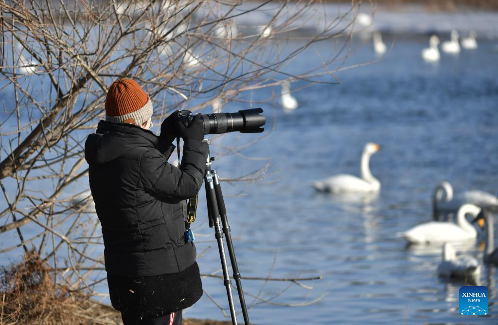 A photography enthusiast takes photos of swans in Hongcun Village, Bajiazi Township, Beipiao of northeast China's Liaoning Province, Feb. 21, 2023.