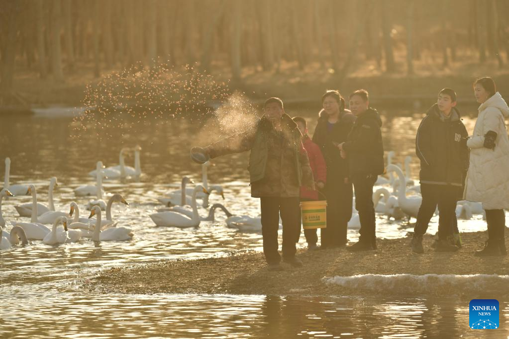 Volunteer Li Haifeng feeds swans in Hongcun Village, Bajiazi Township, Beipiao of northeast China's Liaoning Province, Feb. 21, 2023.