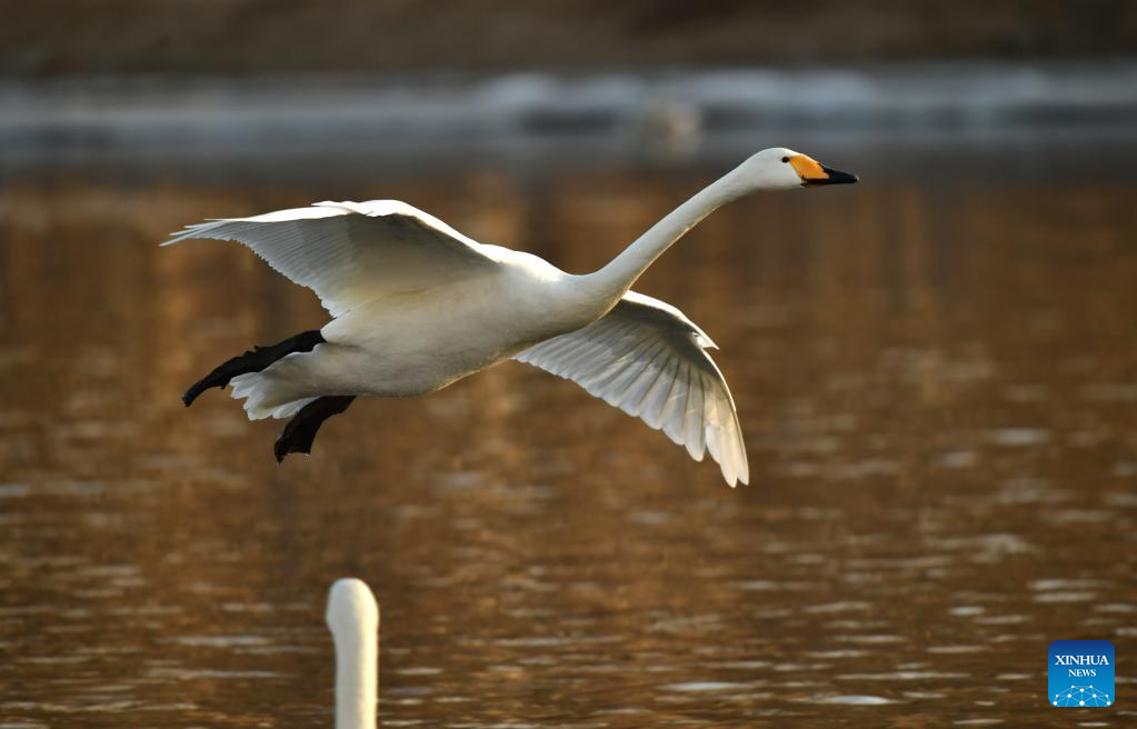 A swan flies in Hongcun Village, Bajiazi Township, Beipiao of northeast China's Liaoning Province, Feb. 21, 2023.