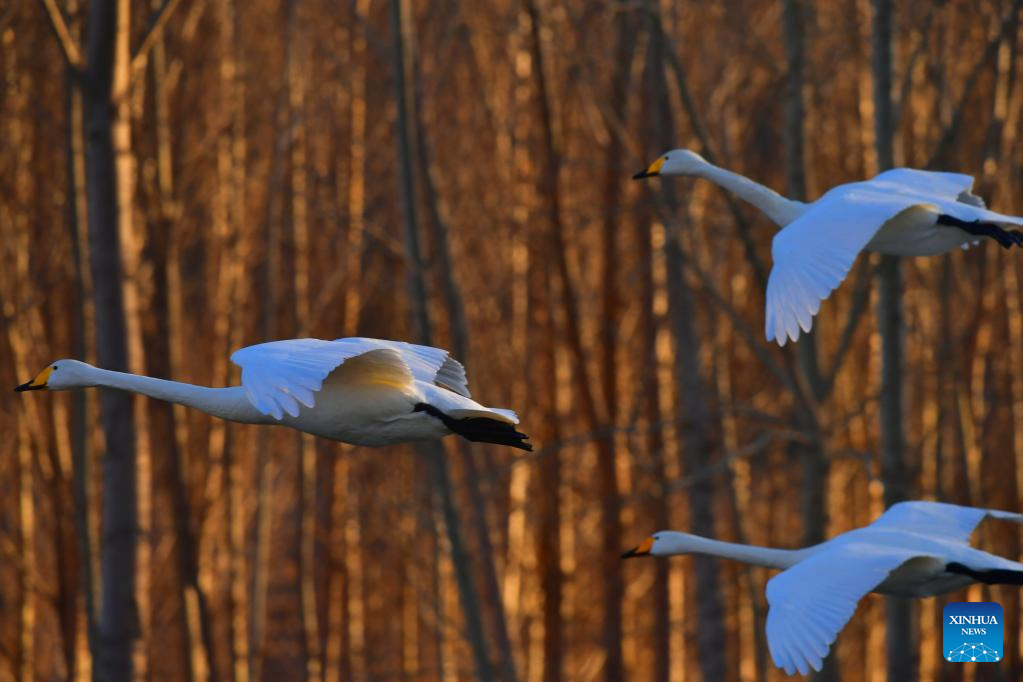 Swans fly in Hongcun Village, Bajiazi Township, Beipiao of northeast China's Liaoning Province, Feb. 21, 2023.