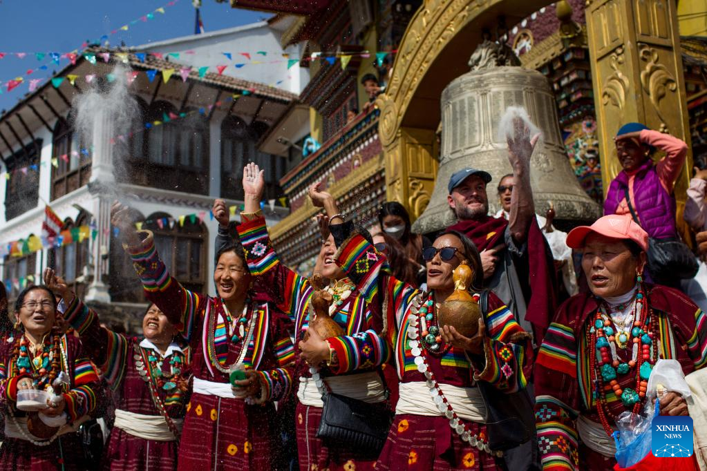 People in traditional attire are seen during the celebration of Gyalpo Lhosar Festival at Boudha in Kathmandu, Nepal, Feb. 23, 2023. (Photo by Sulav Shrestha/Xinhua)