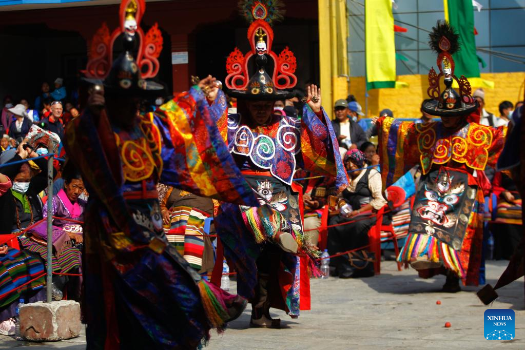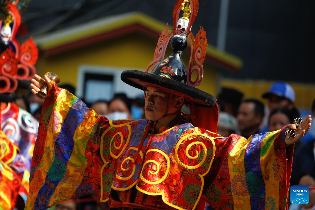 People in traditional attire perform during the celebration of Gyalpo Lhosar Festival at Boudha in Kathmandu, Nepal, Feb. 23, 2023. (Photo by Sulav Shrestha/Xinhua)