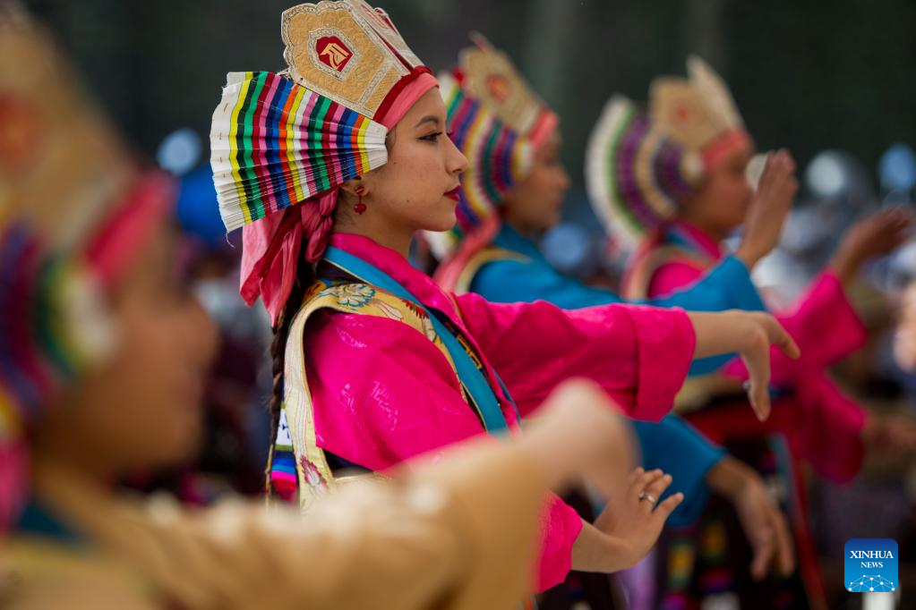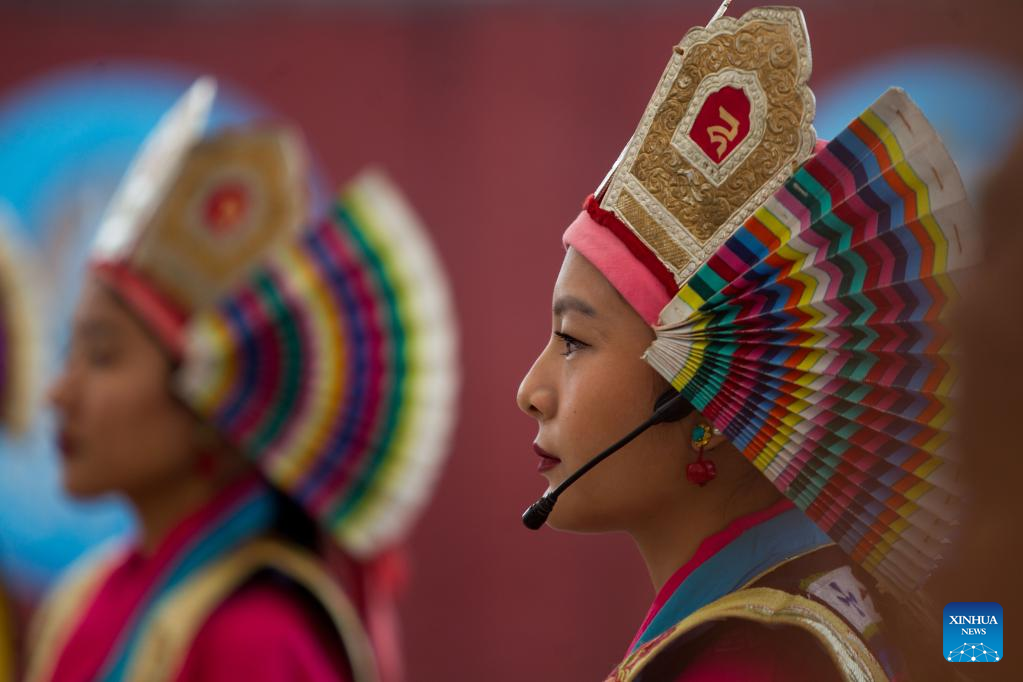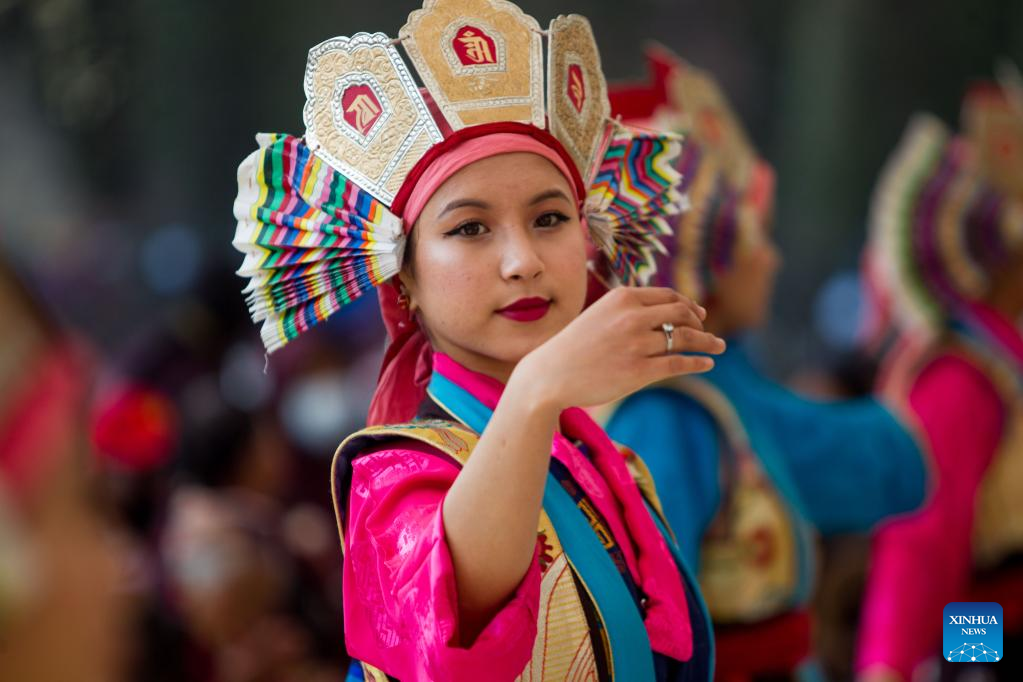 A girl in traditional attire performs during the celebration of Gyalpo Lhosar Festival at Boudha in Kathmandu, Nepal, Feb. 23, 2023. (Photo by Sulav Shrestha/Xinhua)