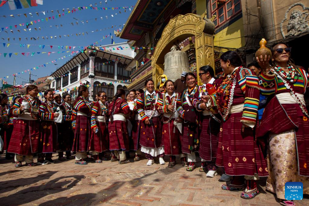 Women in traditional attire are seen during the celebration of Gyalpo Lhosar Festival at Boudha in Kathmandu, Nepal, Feb. 23, 2023. (Photo by Sulav Shrestha/Xinhua)