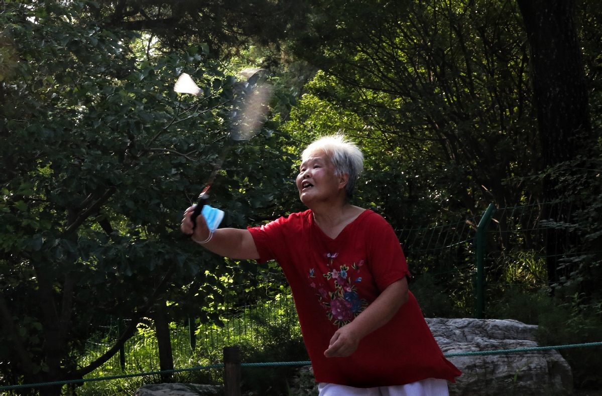 An elderly woman plays badminton at Jingshan Park in Beijing on July 20, 2020. [Photo by Jiang Dong/chinadaily.com.cn]