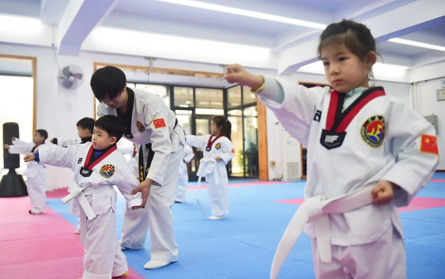 Children learn Taekwondo under the instruction of a teacher at Luoyang Youth Children’s Activity Center, in Luoyang city, north China’s Henan Province. (People’s Daily Online/Huang Zhengwei)