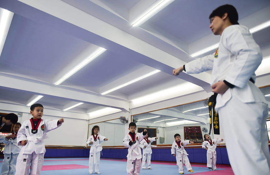 Children learn Taekwondo under the instruction of a teacher at Luoyang Youth Children’s Activity Center, in Luoyang city, north China’s Henan Province. (People’s Daily Online/Huang Zhengwei)