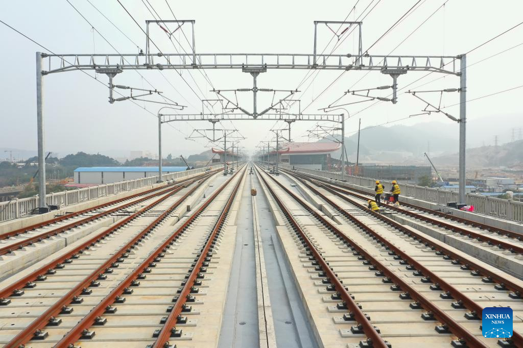 Workers install the suspended ceiling at the waiting hall of Xiamen North Railway Station of the new Fuzhou-Xiamen high-speed railway in Xiamen, southeast China's Fujian Province, Feb. 23, 2023. The 277-km railway runs along southeast China's coastline and crosses over three major bays on gigantic bridges. It's the country's first sea-crossing high-speed railway. With a designed speed of 350 km per hour and eight stations along the route, it is expected to slash the travel time between the two cities to just one hour. (Xinhua)