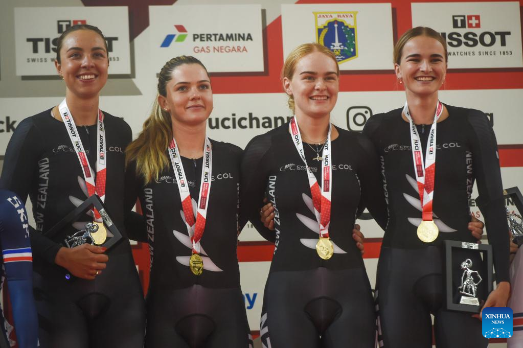 Gold medalists Team New Zealand pose during the medal ceremony of the women's team pursuit at the 2023 UCI Track Cycling Nations Cup in Jakarta, Indonesia, Feb. 24, 2023. (Xinhua/Zulkarnain)
