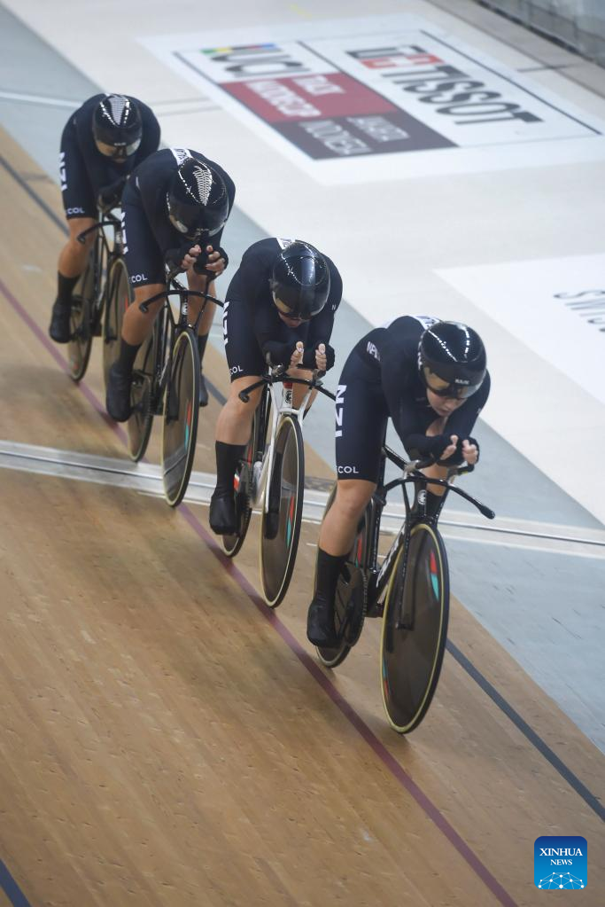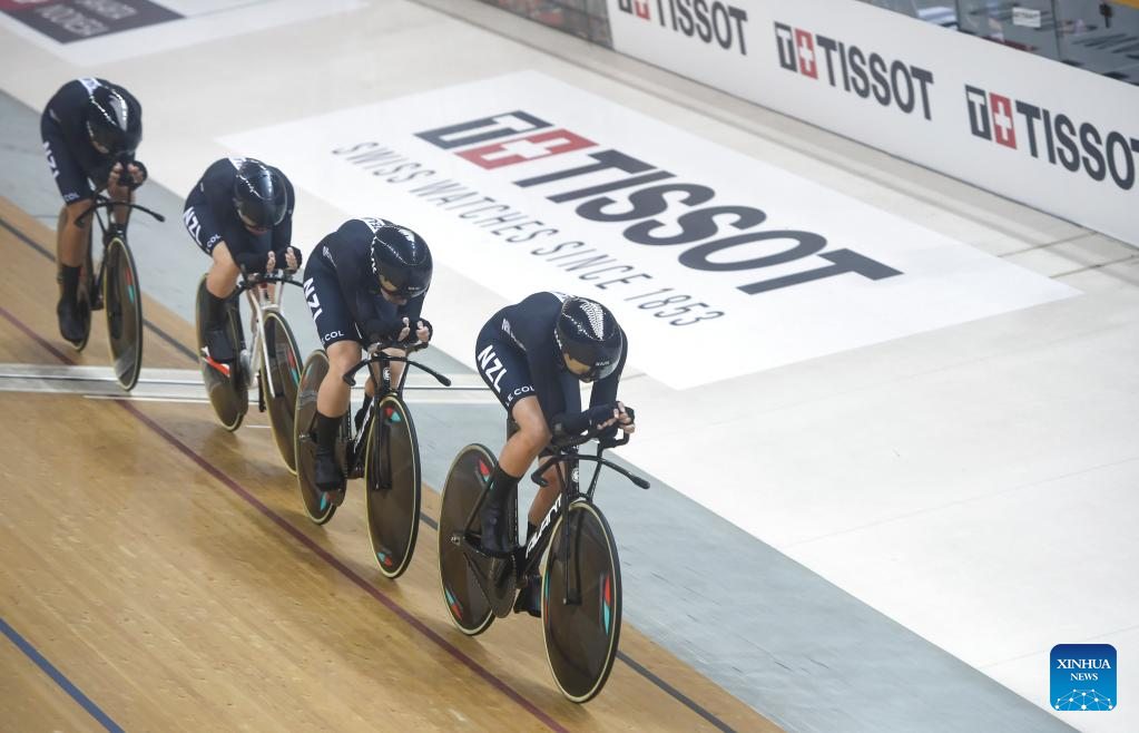 Team New Zealand race during the women's team pursuit final at the 2023 UCI Track Cycling Nations Cup in Jakarta, Indonesia, Feb. 24, 2023. (Xinhua/Zulkarnain)
