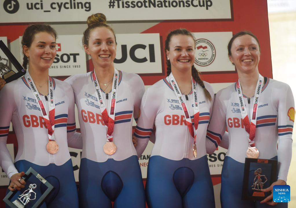 Bronze medalists Team Britain pose during the medal ceremony of the women's team pursuit at the 2023 UCI Track Cycling Nations Cup in Jakarta, Indonesia, Feb. 24, 2023. (Xinhua/Zulkarnain)