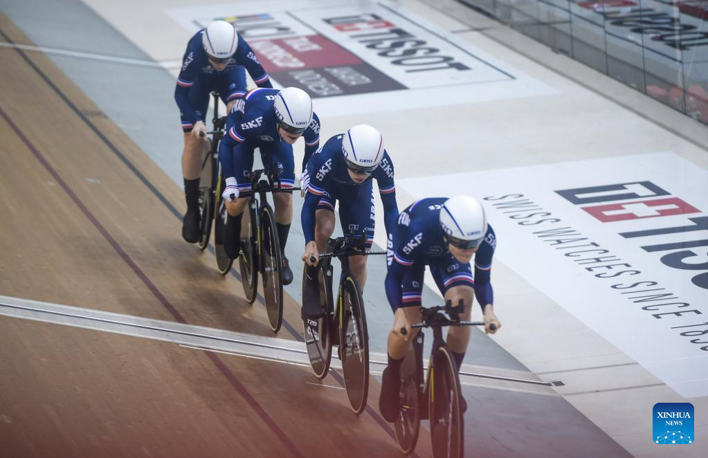Team France race during the women's team pursuit final at the 2023 UCI Track Cycling Nations Cup in Jakarta, Indonesia, Feb. 24, 2023. (Xinhua/Zulkarnain)
