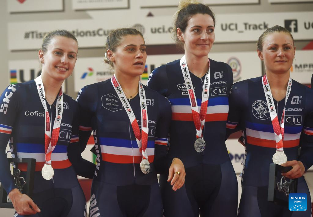 Silver medalists Team France pose during the medal ceremony of the women's team pursuit at the 2023 UCI Track Cycling Nations Cup in Jakarta, Indonesia, Feb. 24, 2023. (Xinhua/Zulkarnain)