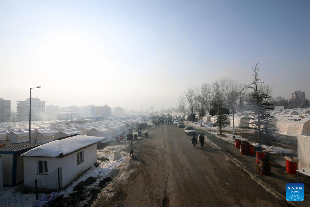 People walk past temporary tents in the quake-hit city of Kahramanmaras, Türkiye, on Feb. 24, 2023. (Photo by Mustafa Kaya/Xinhua)