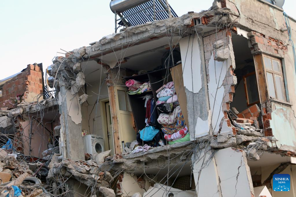 Belongings are seen in a destroyed building in the quake-hit city of Kahramanmaras, Türkiye, on Feb. 24, 2023. (Photo by Mustafa Kaya/Xinhua)