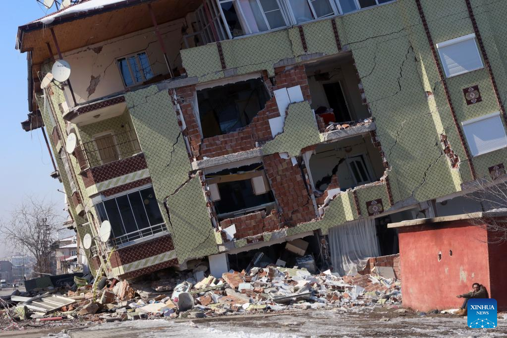 A man sits on the ground in front of a destroyed building in the quake-hit city of Kahramanmaras, Türkiye, on Feb. 24, 2023. (Photo by Mustafa Kaya/Xinhua)