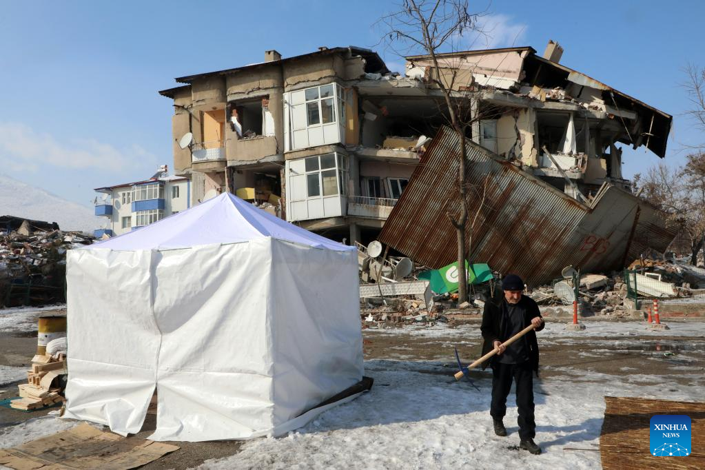 A man walks past a tent in front of a destroyed building in the quake-hit city of Kahramanmaras, Türkiye, on Feb. 24, 2023. (Photo by Mustafa Kaya/Xinhua)