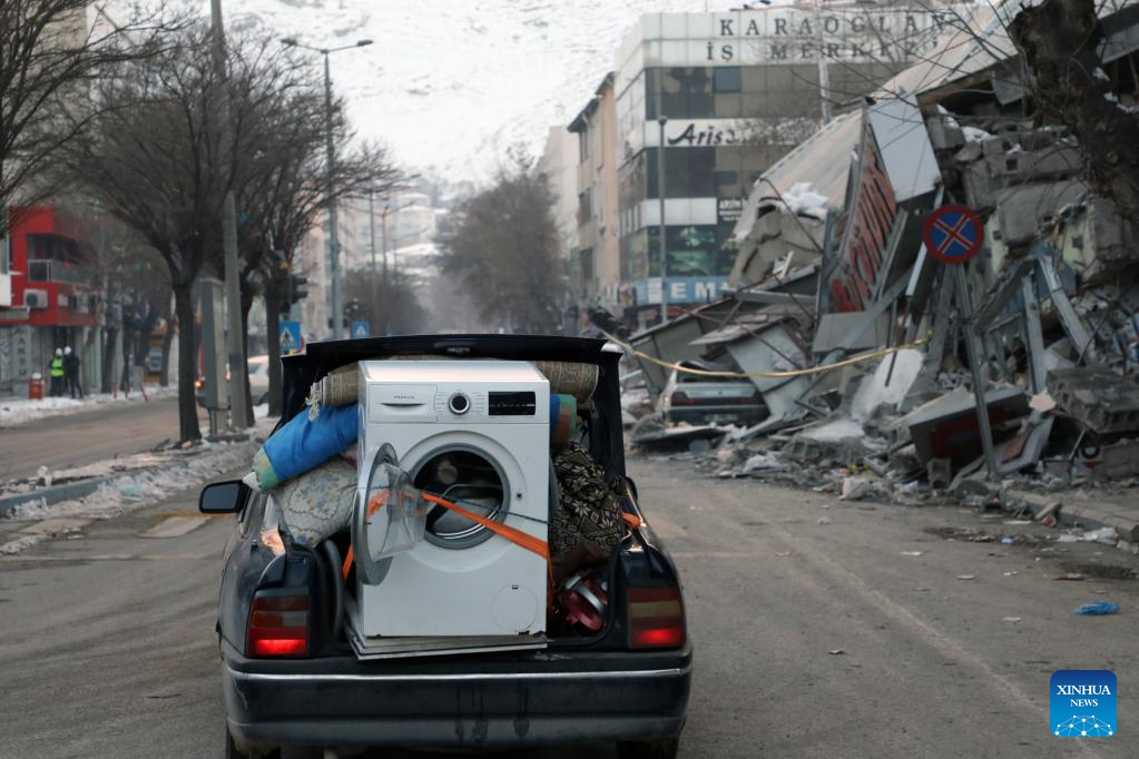 A vehicle with belongings runs past a destroyed building in the quake-hit city of Kahramanmaras, Türkiye, on Feb. 24, 2023. (Photo by Mustafa Kaya/Xinhua)