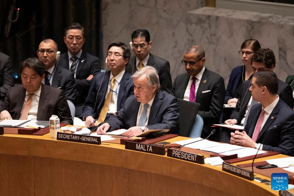 The UN Security Council holds a high-level meeting on Ukraine at the UN headquarters in New York, on Feb. 24, 2023. UN Secretary-General Antonio Guterres on Friday called for preventing further escalation of the conflict in Ukraine and giving peace "a chance." (Xinhua/Xie E)