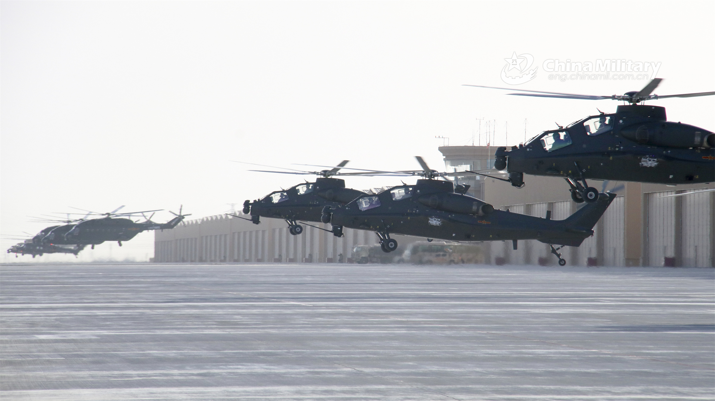 Helicopters attached to an army aviation brigade under the PLA 76th Group Army lift off for a flight training exercise in early February, 2023. (eng.chinamil.com.cn/Photo by Yang Mingfu)